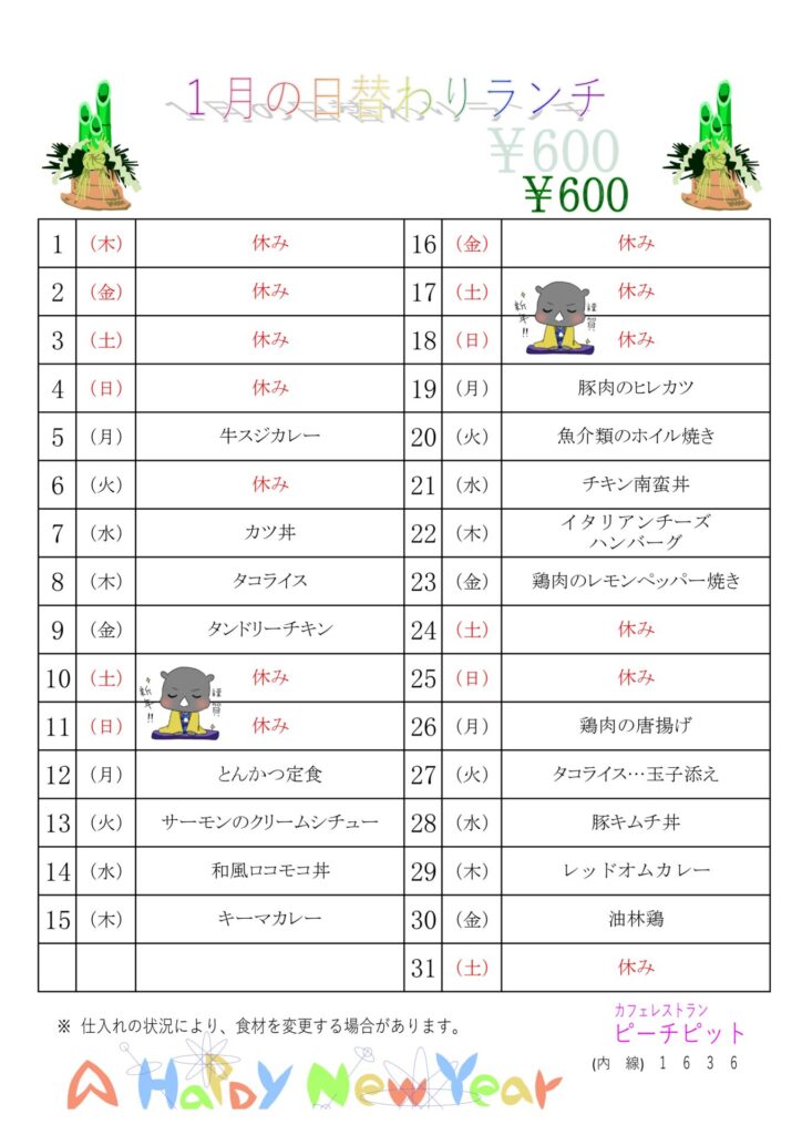 2026年になりました!1月の日替わりランチです!